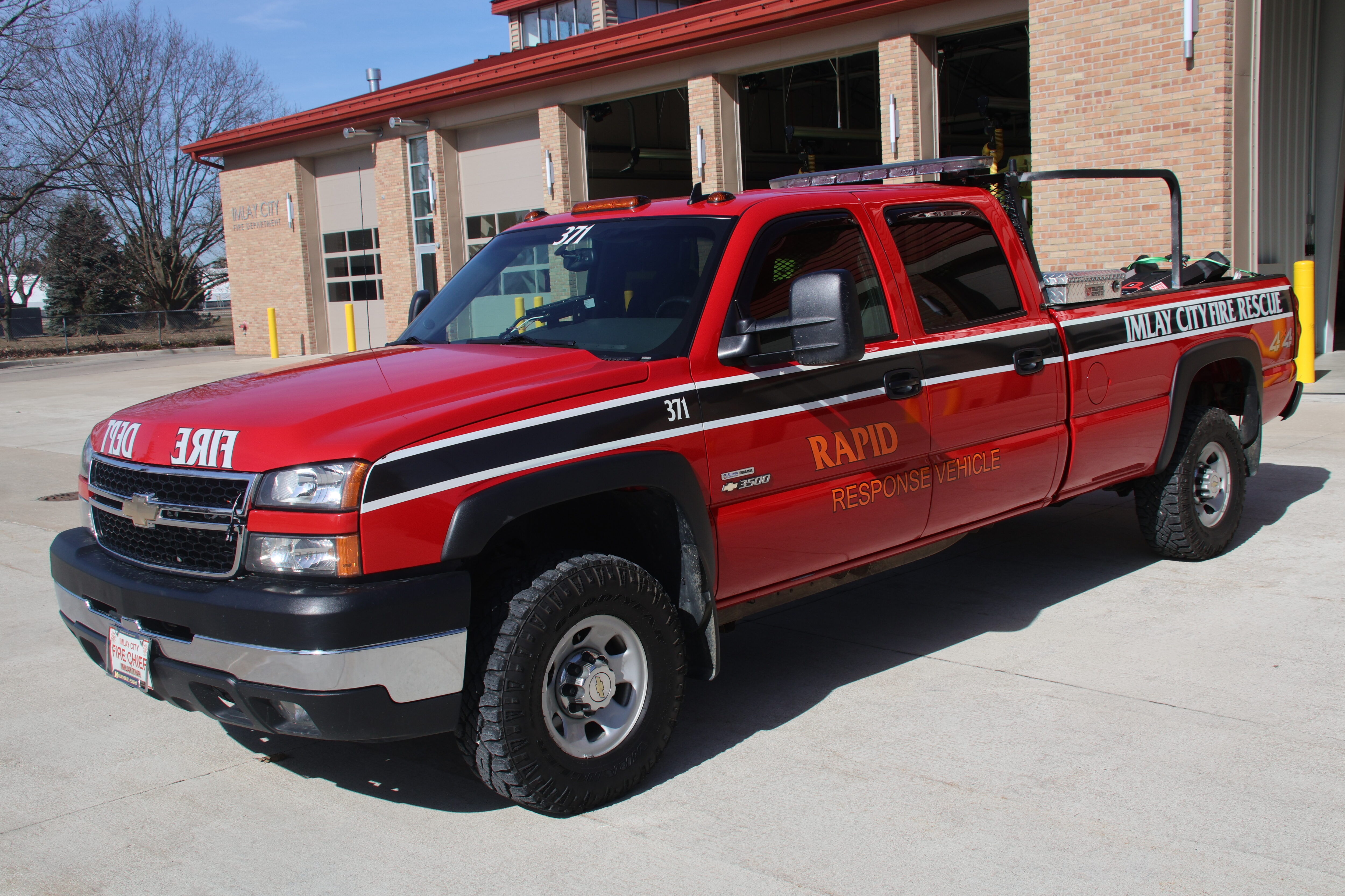Utility 371 is a 2007 Chevrolet Silverado 3500 heavy-duty diesel pickup truck. It is equipped with clean-up agents for roadside spill responses and a portable lighting tower. This vehicle can seat four firefighters and can be used as a squad to transport extra resources, and move equipment on the scene and between the fire hall and the scene.